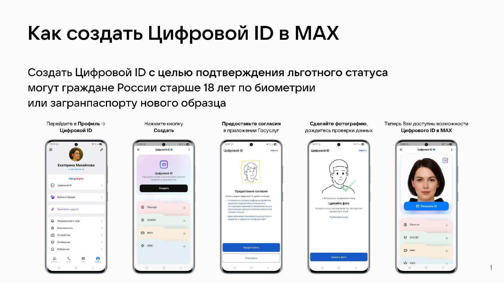 Создать цифровой ID с целью подтверждения льготного статуса могут граждане России старше 18 лет по биометрии или загранпаспорту нового образца Подробности смотрите в карточках